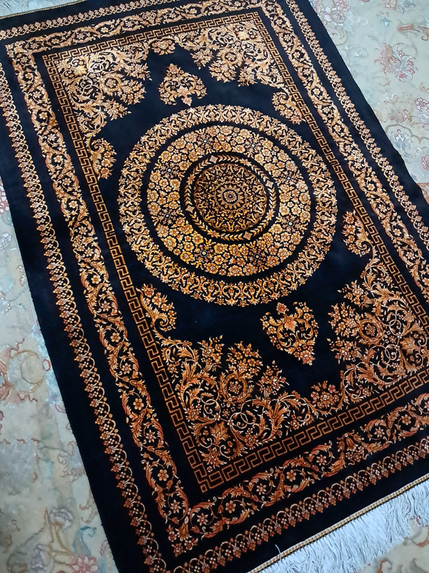 فرش دستبافت/ قالیچه تمام ابریشم زرغ و نیم ۷۰رج طرح ورساچه