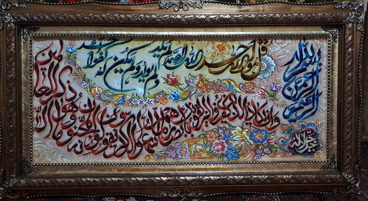 این تابلوفرش از دو ایه شریفه وان یکاد و قل هو الله بافته شده است....سایز این تابلو بسیار بزرگ است طراح آیه های قرآن بسیار زیبا و به صورت طراحی شیپوری میباشد....