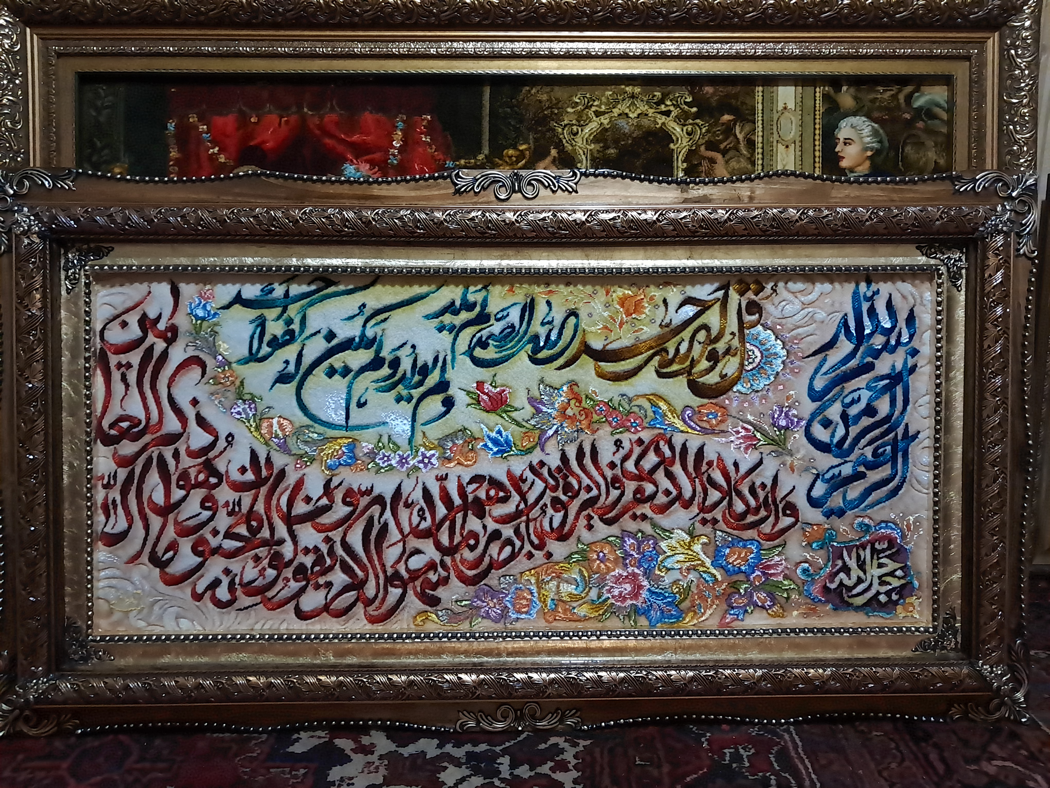 این تابلوفرش از دو ایه شریفه وان یکاد و قل هو الله بافته شده است....سایز این تابلو بسیار بزرگ است طراح آیه های قرآن بسیار زیبا و به صورت طراحی شیپوری میباشد....