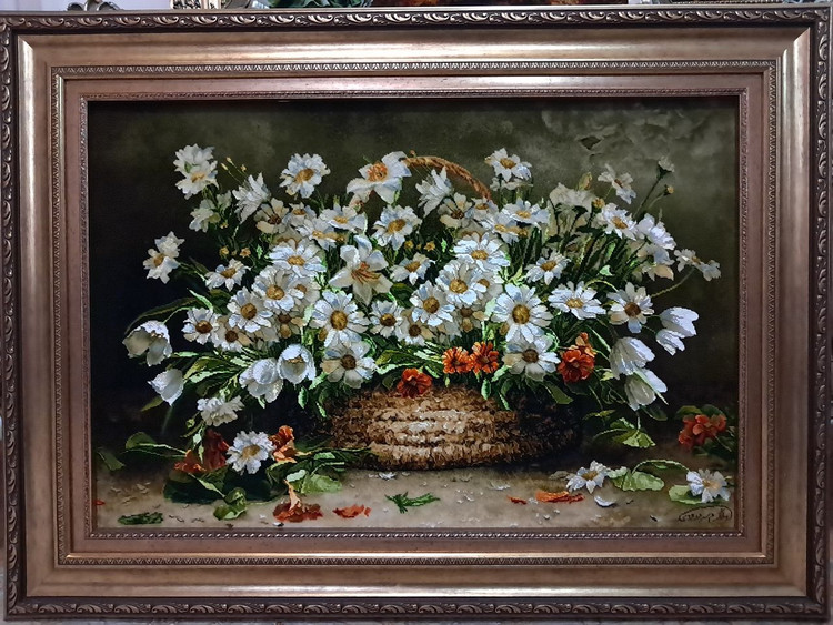 تابلوفرش های طرح گل با گل های سفید همیشه جز پرطرفدادارترین های طرح گل بوده....معمولا طرح گل یو دست سفید برای علاقه مندان به تابلوفرش جذابیته خاصی دارد...تابلوفرش فوق با گلها ی یک دست سفید بابونه و بافت ۵۰ رج کامل میباشد...دربافت گل ها ابریشم بسیار زیادی به کار برده شده است..این تابلو محصول هنرمندی استاد دلگرمی طراح و بافنده تبریز(سردرود)میباشد