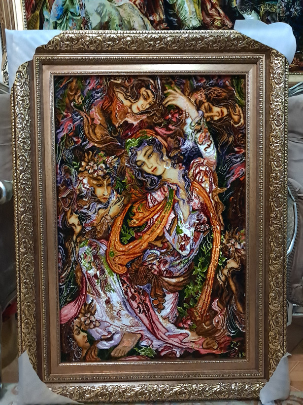 تابلو فرش فوق از طرح بسیار معروف استادفرشچیان(هفت چهره) میباشد.چله این تابلو ابریشم است و بافنده از گره های بسیار متعدد در بافت تابلو استفاده کرده است با رجشمار ۵۰ ..طرح های مینیاتوری جز پرطرفدادارترین طرح های تابلو مخصوصا برای مخاطبان و مشتریان خارجی میباشد