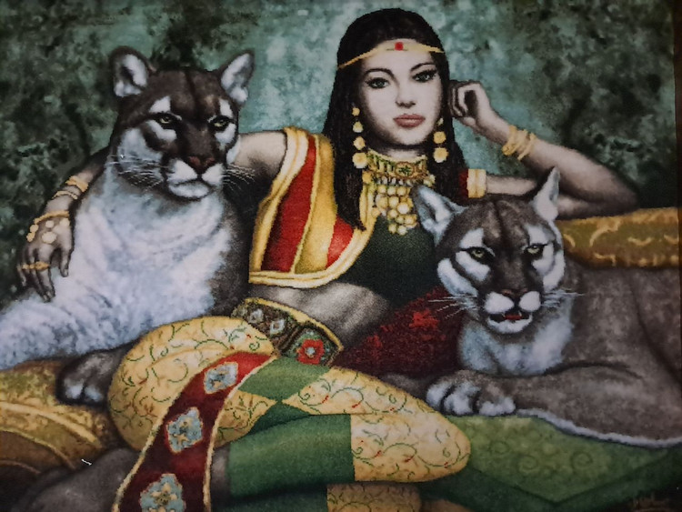 تابلوفرش فوق طرح دختر رومیکا...تصویر دختری رو درکنار دو سیاهگوش(گربه وحشی)به تصویر میکشد..که از تولیدات و مارک معتبر استاد سلطانی میباشد....چله کار ابریشم و رجشمار ۵۰ این تابلو رو به یک اثر هنری دستباف تبدیل کرده است