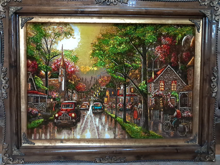 تابلوفرش فرش فوق از طرح های خیابانی تاریخی میباشد...منظره خیابان شانزالیزه با بافت سنتی شهر یک اثر دستباف هنری راخلق کرده...و سمبل خیابان تاریخی شانزالیزه را به زیبایی به تصویر میکشد...چله کار ابریشم و ۵۰ رج میباشد