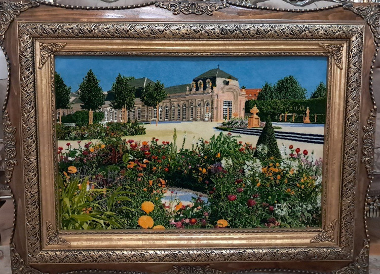 تابلوفرش طرح کاخ ورسای با بافت ۶۰ رج توسط طراح و هنرمند تبریزی استاد بالازادگان یک اثر هنری را خلق کرده...بافت ریز ،چله ابریشم و طبیعی بودن این تابلوفرش که مانند یک عکس بافته شده از ویژه گی های این تابلوفرش است