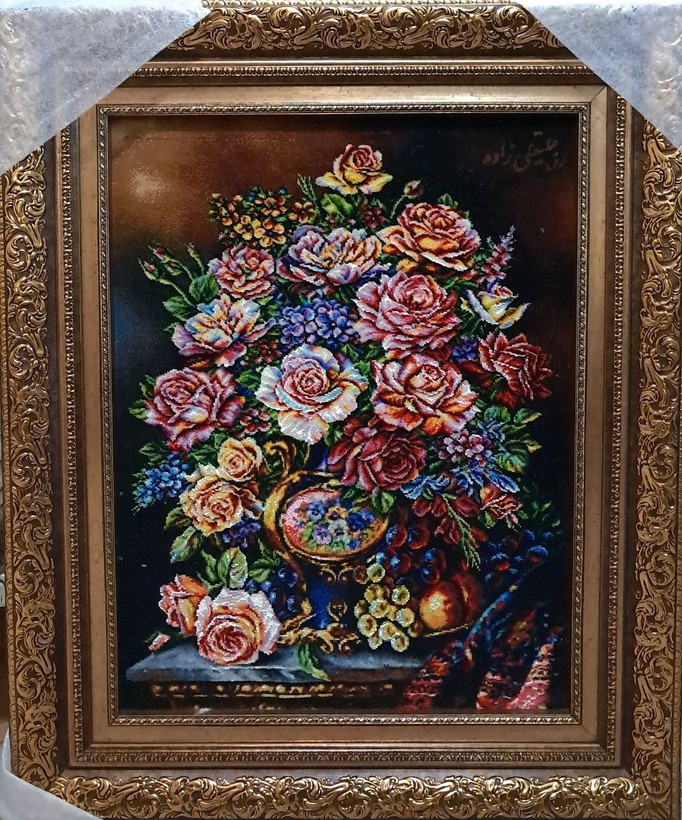 تابلوفرش فوق از تولیدی تابلوفرش عقیلی زاده سردرود تبریز میباشد....طرح گل گلدان یا میوه های مختلف در اطراف تابلو مشهود است. چله کار ابریشم و رجشمار آن ۵۰ میباشد....دریافت این تابلو از ابریشم زیادی استفاده شده است